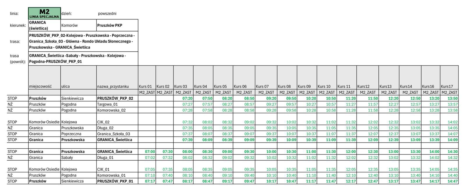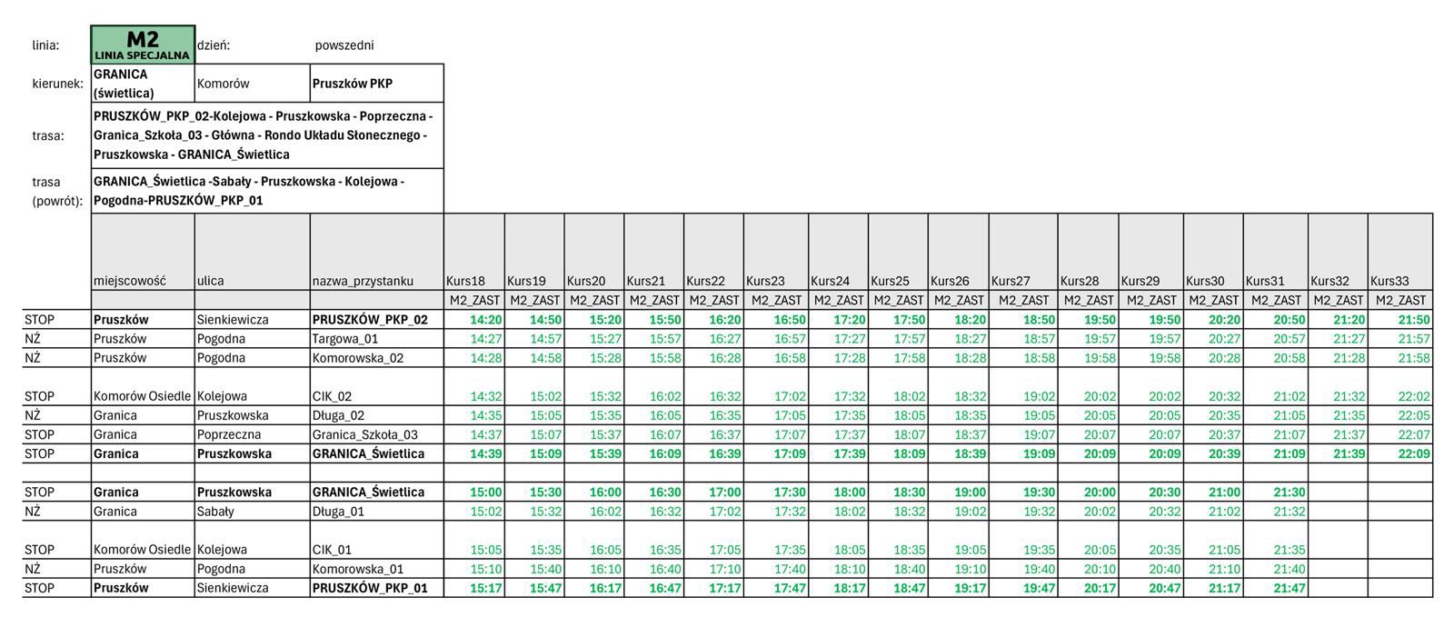 Trasa powrotna: PKP Pruszków → Targowa → Komorowska (Pogodna) → CIK Komorów (ul. Kolejowa) → Granica ul. Długa (Pruszkowska) → Granica Szkoła (Poprzeczna) → Granica (Świetlica)